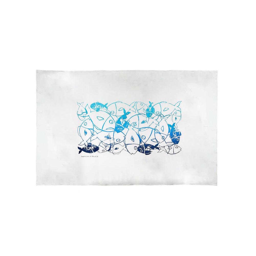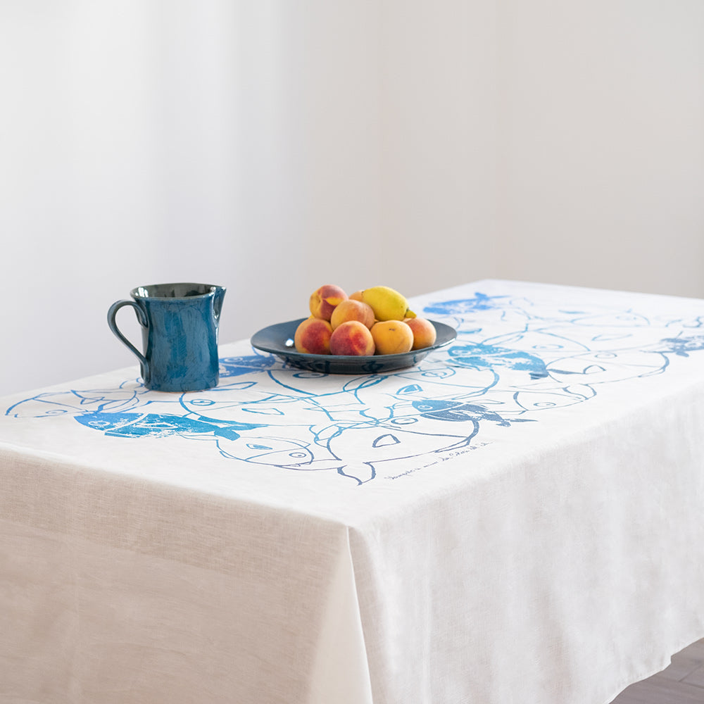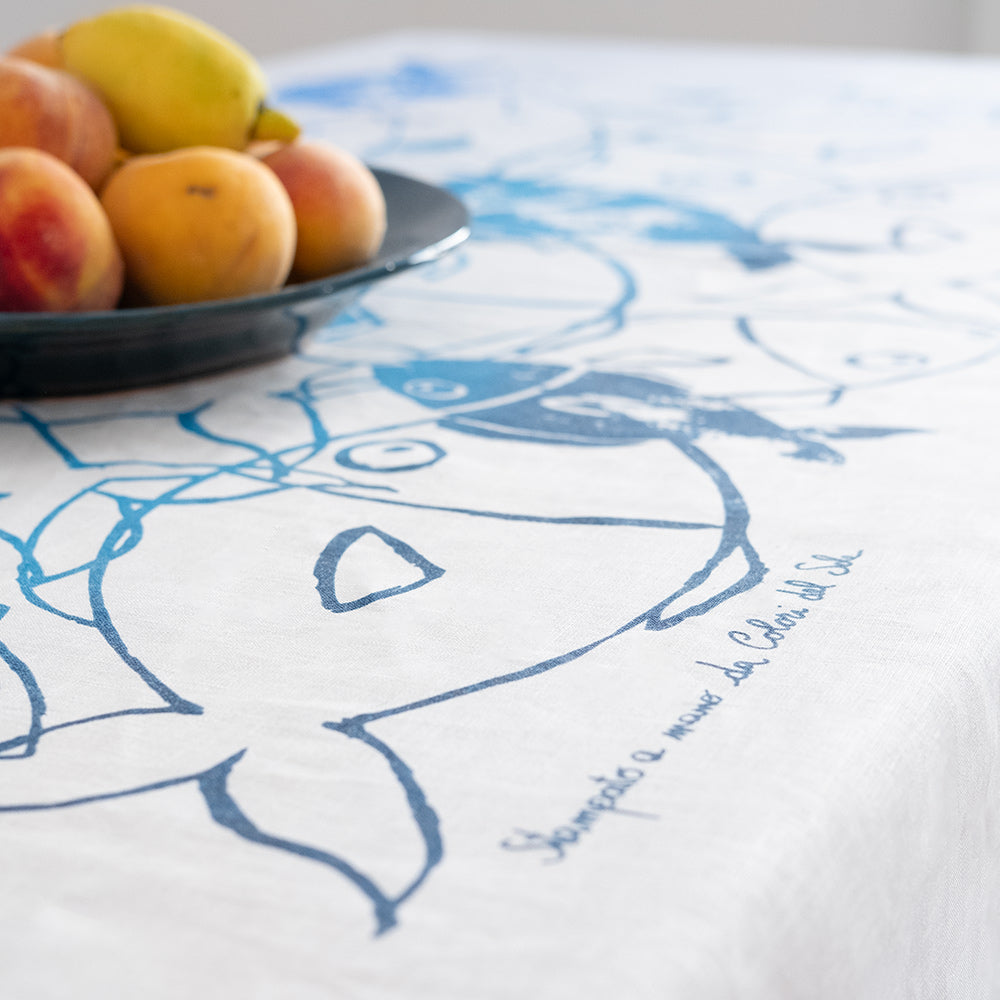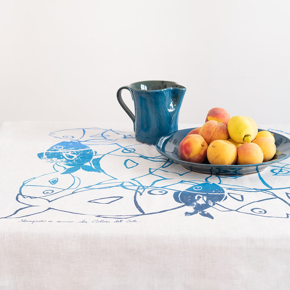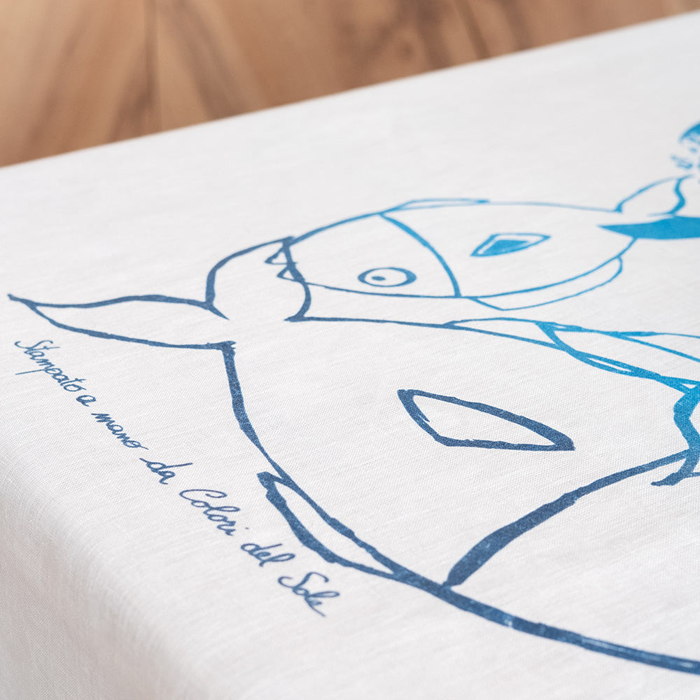 Tovaglia rettangolare in lino naturale decorata a mano con la tecnica della stampa serigrafica. Porta in tavola la vivacità con i motivi ispirati alla mediterraneità in pieno stile Colori del Sole. Disponibile nei toni dell’azzurro e del rosso.