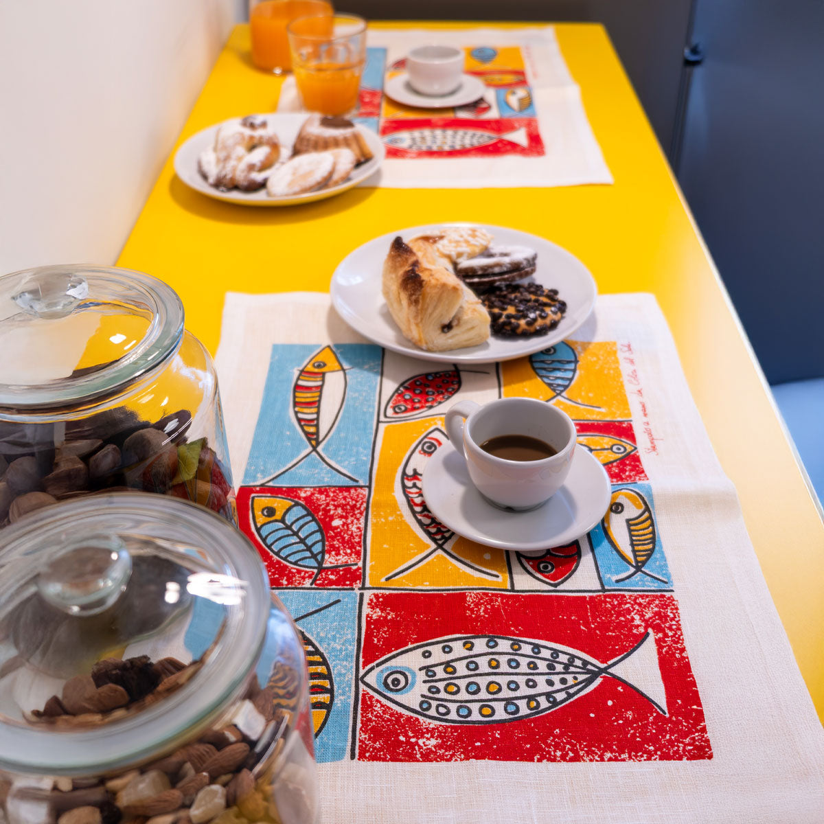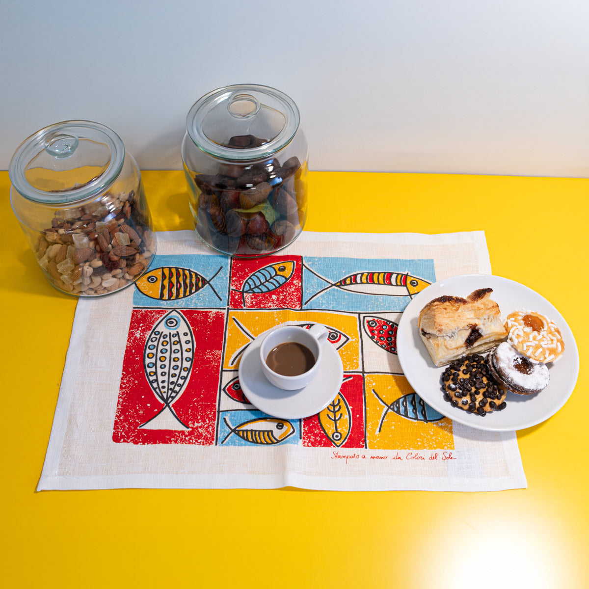 Set composto da due tovagliette americane di lino decorate da stampa serigrafica manuale con pesci nei toni del rosso, del giallo e del turchese. La linea Mondrian con un design geometrico, colorato e audace, omaggia il noto artista omonimo e porta sulla tavola la vivacità e il gusto tipici dell'arte moderna. La stampa artigianale, contrariamente alla stampa digitale, penetra le fibre del tessuto naturale e ne esalta la trama, conferendo alle tovagliette dettagli ben definiti e vividi.