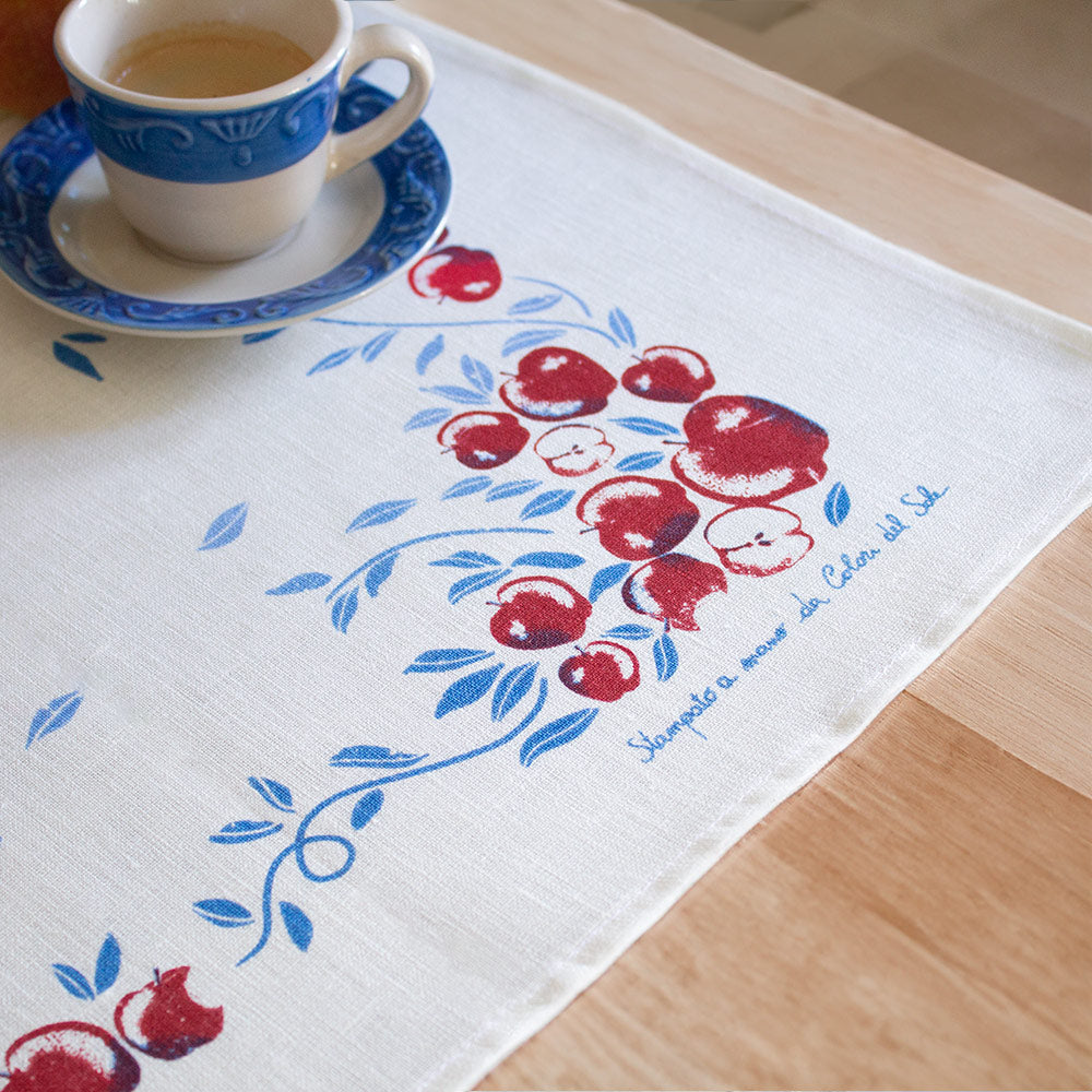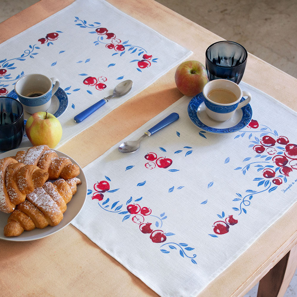 Set composto da due tovagliette americane realizzate in puro lino decorate con stampa serigrafica fatta a mano. Mele e viti in tonalità di blu e rosso portano colore e armonia sulla tavola, adatte sia per pasti informali che per occasioni speciali.